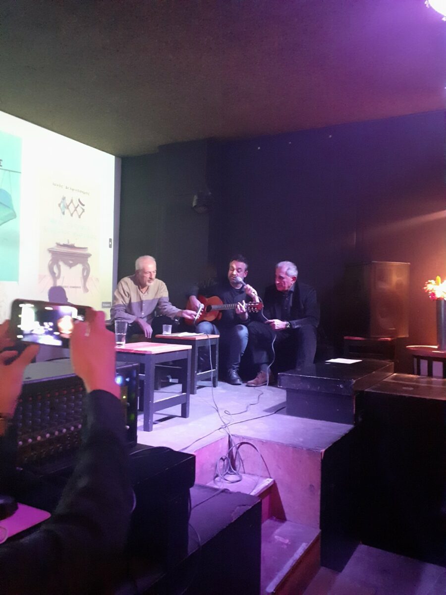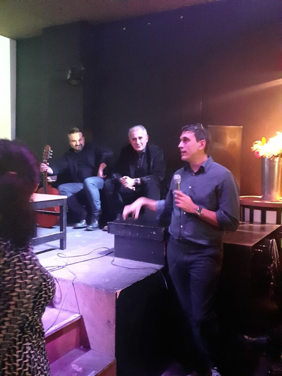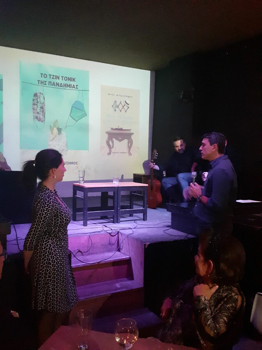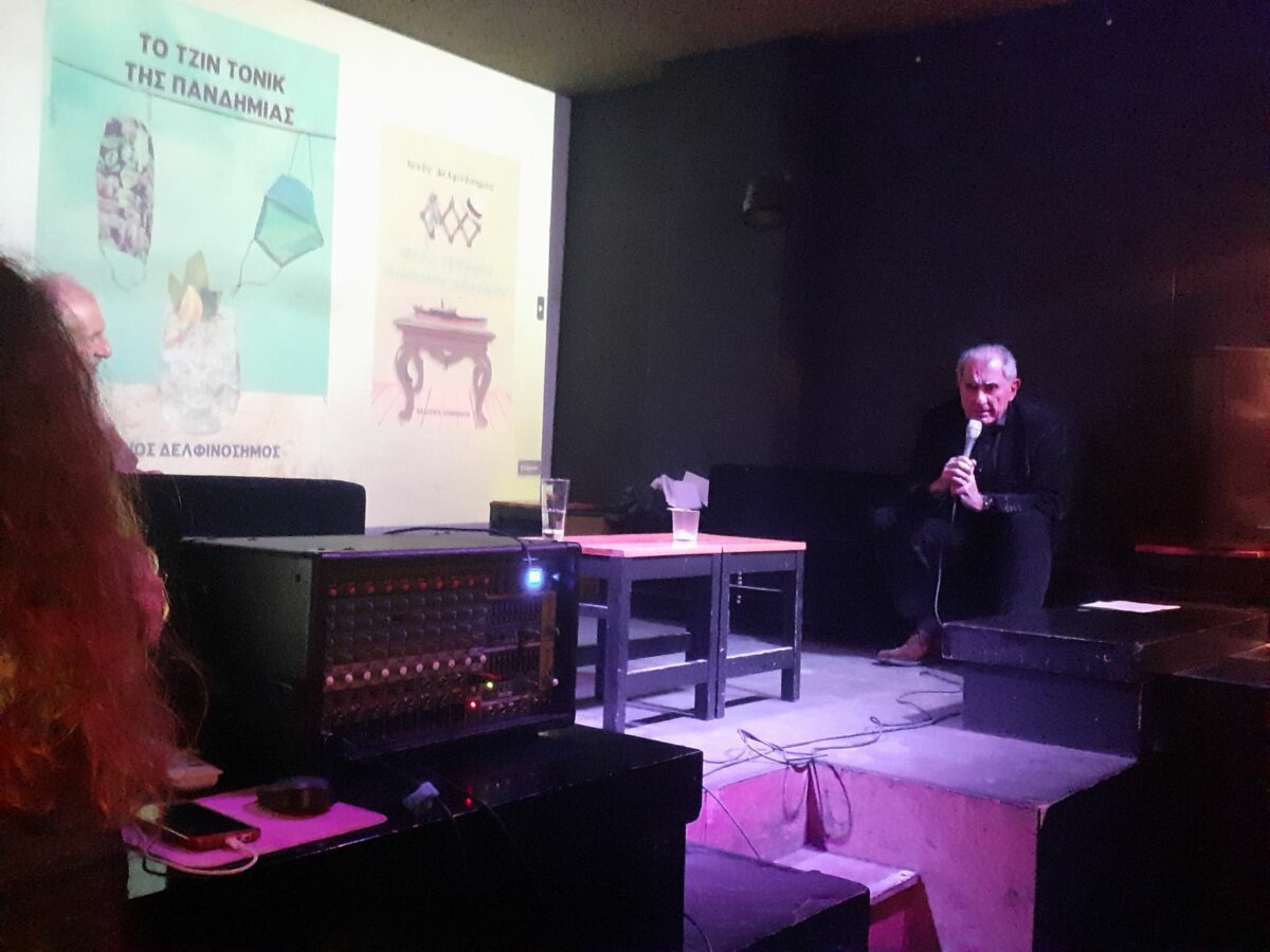 Πολύς ο κόσμος, ωραία η ατμόσφαιρα, με τζαζ μουσική και χαμηλό φωτισμό, και στο εστιατόριο Fouar, στη Μητροπόλεως, πραγματοποιήθηκε η παρουσίαση του έργου του Ιανού Δελφινόσημου (“Το τζιν τόνικ της πανδημίας”, “Θεός όμορφος, διάβολος νόστιμος” και “Παραμύθι μιας χίμαιρας”) με πολλή συζήτηση, στα όρια της φιλοσοφίας, βίντεο, τραγούδι, προσωπικές εκμυστηρεύσεις και χιούμορ.